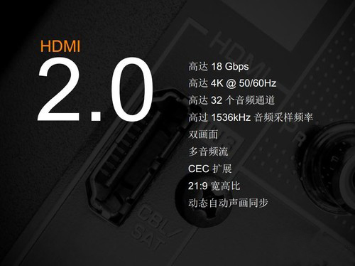 HDMI 2.0的帶寬擴(kuò)充到了18Gbps,支持即插即用和熱插拔,支持3840×2160分辨率和50FPS、60FPS幀率。同時在音頻方面支持最多32個聲道,以及最高1536kHz采樣率。HDMI 2.0并沒有定義新的數(shù)據(jù)線和接頭、接口,因此能保持對HDMI 1.x的完美向下兼容,現(xiàn)有的二類數(shù)據(jù)線可直接使用。HDMI 2.0并不會取代HDMI 1.x,而是基于后者的增強(qiáng),任何設(shè)備要想支持HDMI 2.0必須首先保證對HDMI 1.x的基礎(chǔ)性支持。