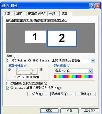 設(shè)置方法: 連接好HDMI線兩端的設(shè)備,電腦啟動后,在windows 桌面,單擊鼠標(biāo)右鍵,選擇屬性,在打開的“顯示屬性”的“設(shè)置”頁面里看到所連接的顯示器,只是在沒有配置以前它是沒有輸出的(低亮的)。用鼠標(biāo)選中要配 置的顯示器(如下圖),并點(diǎn)選“將Windows 桌面擴(kuò)展到該監(jiān)視器上”,就可以將Windows的一部分桌面延伸到電視了,電視(擴(kuò)展顯示器)上沒有狀態(tài)條,沒有快捷按鈕,只有一個桌面墻紙,你可以將 大部分應(yīng)用程序用鼠標(biāo)拖到擴(kuò)展屏幕上運(yùn)行,感覺和主屏幕上沒什么區(qū)別。如果點(diǎn)選“使用該設(shè)備作為主監(jiān)視器”,就可以在顯示器和電視之間選擇用哪個作為主顯示器。