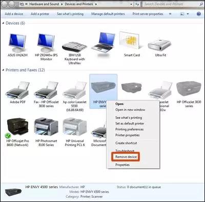 斷開電腦上的打印機 USB 連接線。在驅動程序安裝過程中如果未出現(xiàn)提示,請勿重新連接連接線。 在 Windows 中搜索“設備”,然后在結果列表中點擊設備和打印機控制面板設置。 右擊打印機型號圖標,然后點擊“移除設備”。如果顯示多個打印機圖標,請全部移除。 圖片 : 從“設備和打印機”中移除打印機