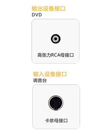 | 調(diào)音臺(tái)音頻線接口 1、標(biāo)準(zhǔn)RCA和卡儂公端子接口 2、接駁方便,撥插力度適中 |