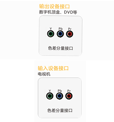 | 色差線接法 將RCA(紅藍(lán)綠對(duì)應(yīng))端子插入數(shù)字機(jī)頂盒或DVD插座輸出設(shè)備對(duì)應(yīng)接口,另一端RCA(紅藍(lán)綠對(duì)應(yīng))端子插入電視機(jī)輸入接口即可。 |