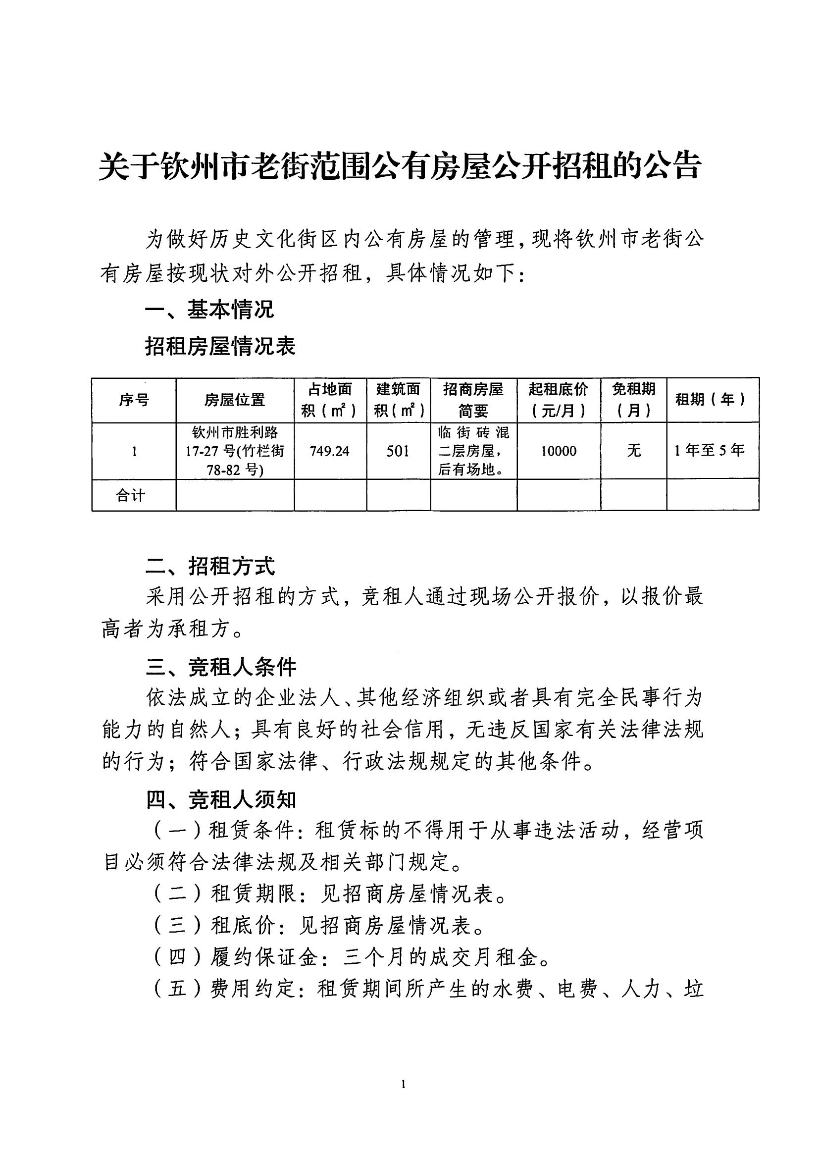 關(guān)于欽州市老街范圍公有房屋公開招租的公告