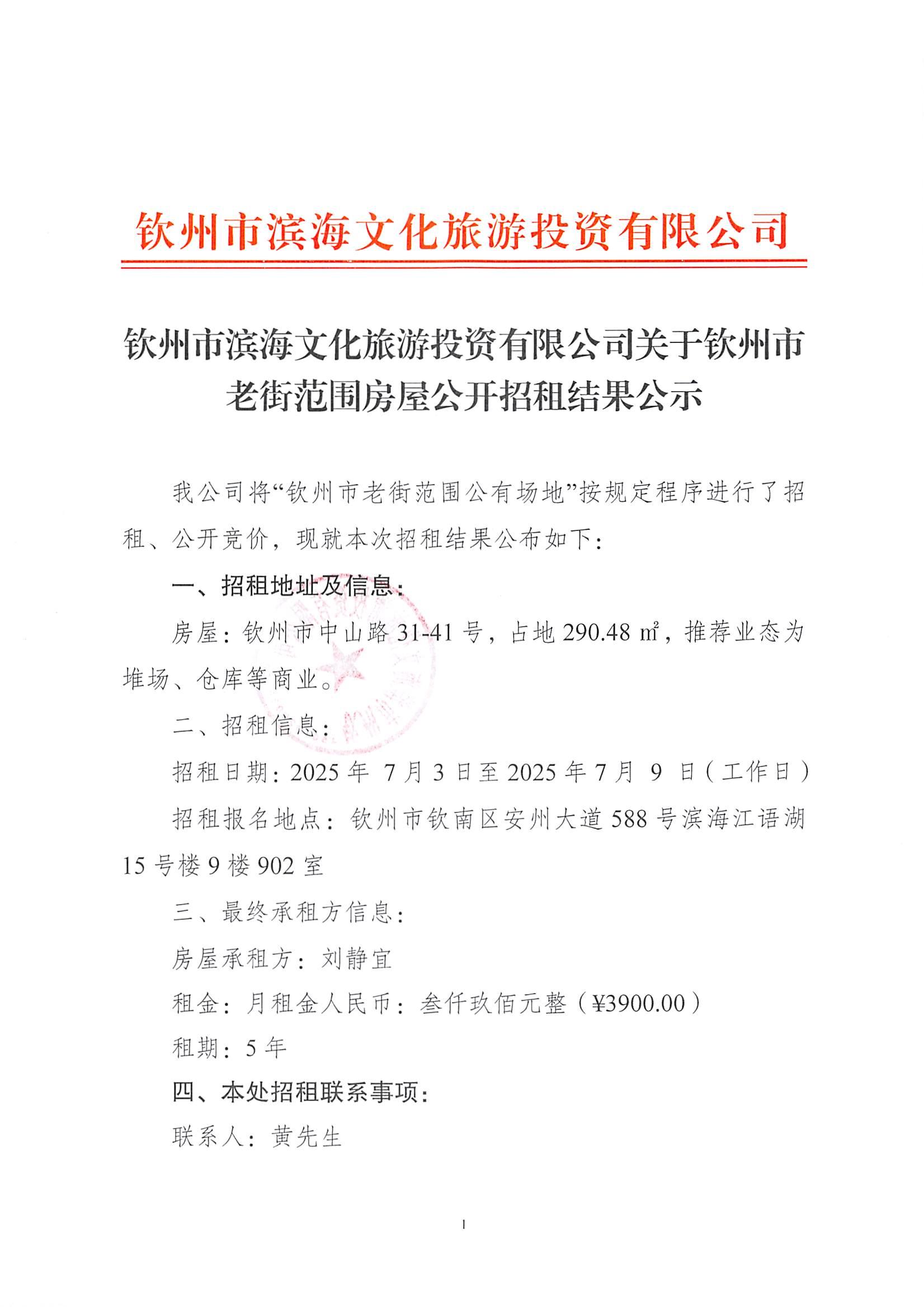 欽州市濱海文化旅游投資有限公司關(guān)于欽州市老街范圍二馬路43號(hào)房屋公開(kāi)招租結(jié)果公示