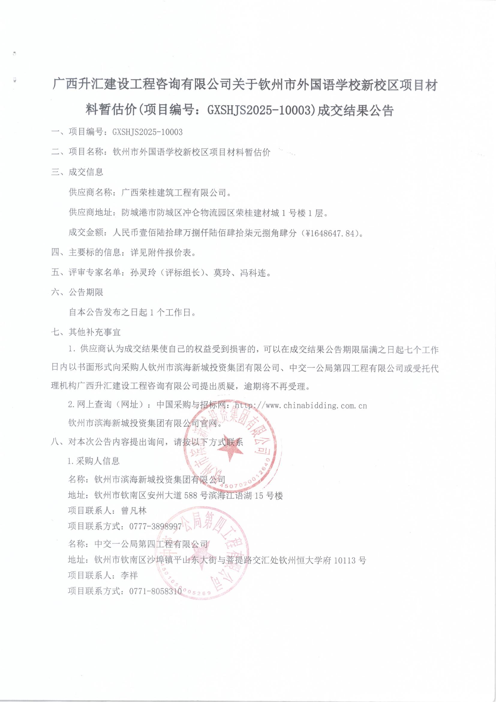 成交結(jié)果公告(欽州市外國(guó)語(yǔ)學(xué)校新校區(qū)項(xiàng)目材料暫估價(jià))
