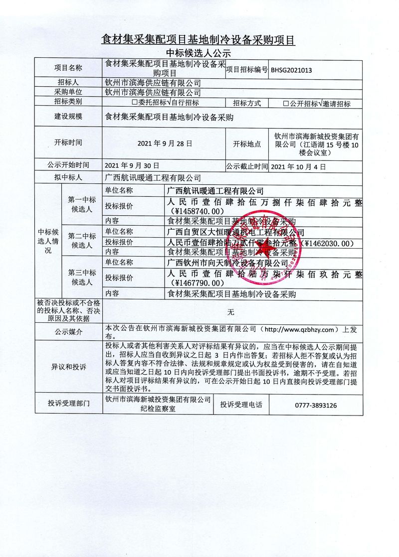 食材集采集配項(xiàng)目基地制冷設(shè)備采購項(xiàng)目中標(biāo)候選人公示
