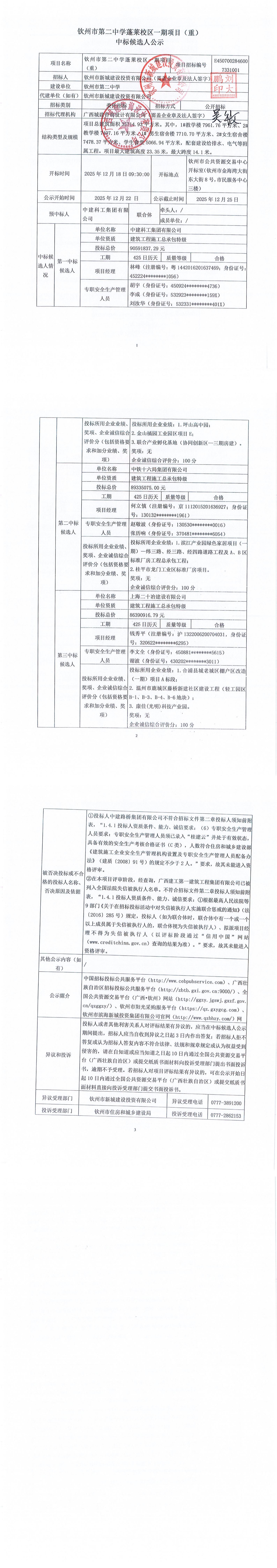 中標候選人公示-欽州市第二中學蓬萊校區(qū)一期項目(重)