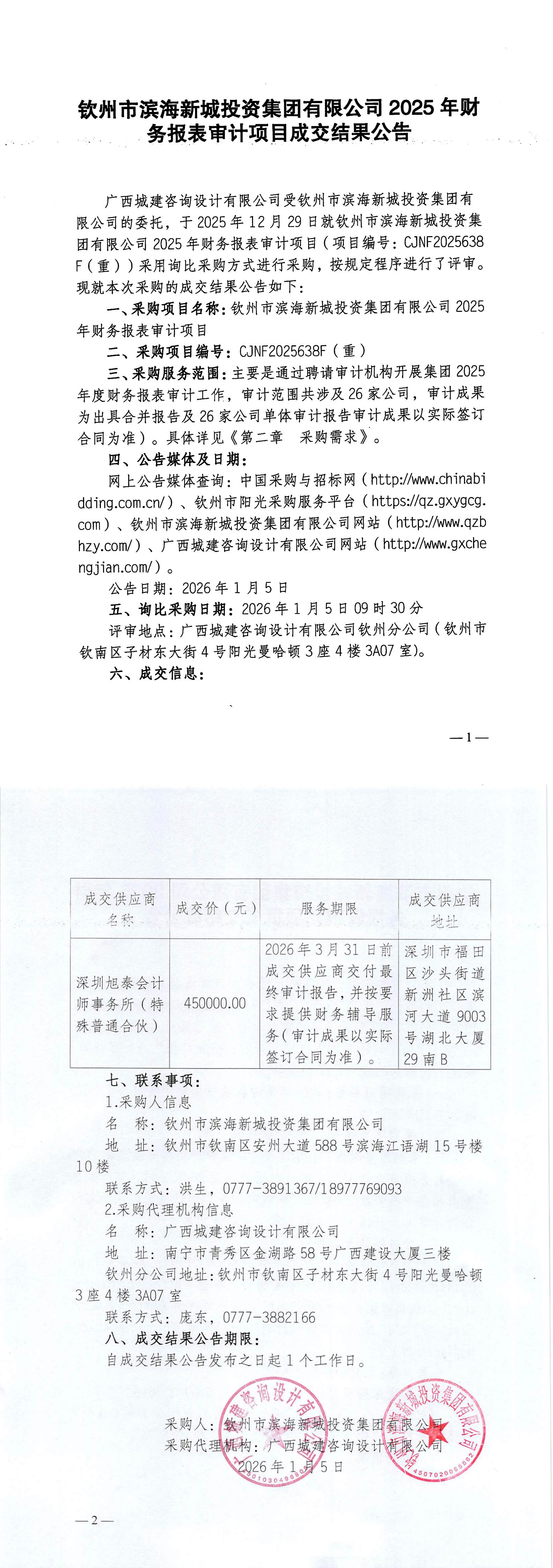 欽州市濱海新城投資集團有限公司2025年財務報表審計項目成交結果公告