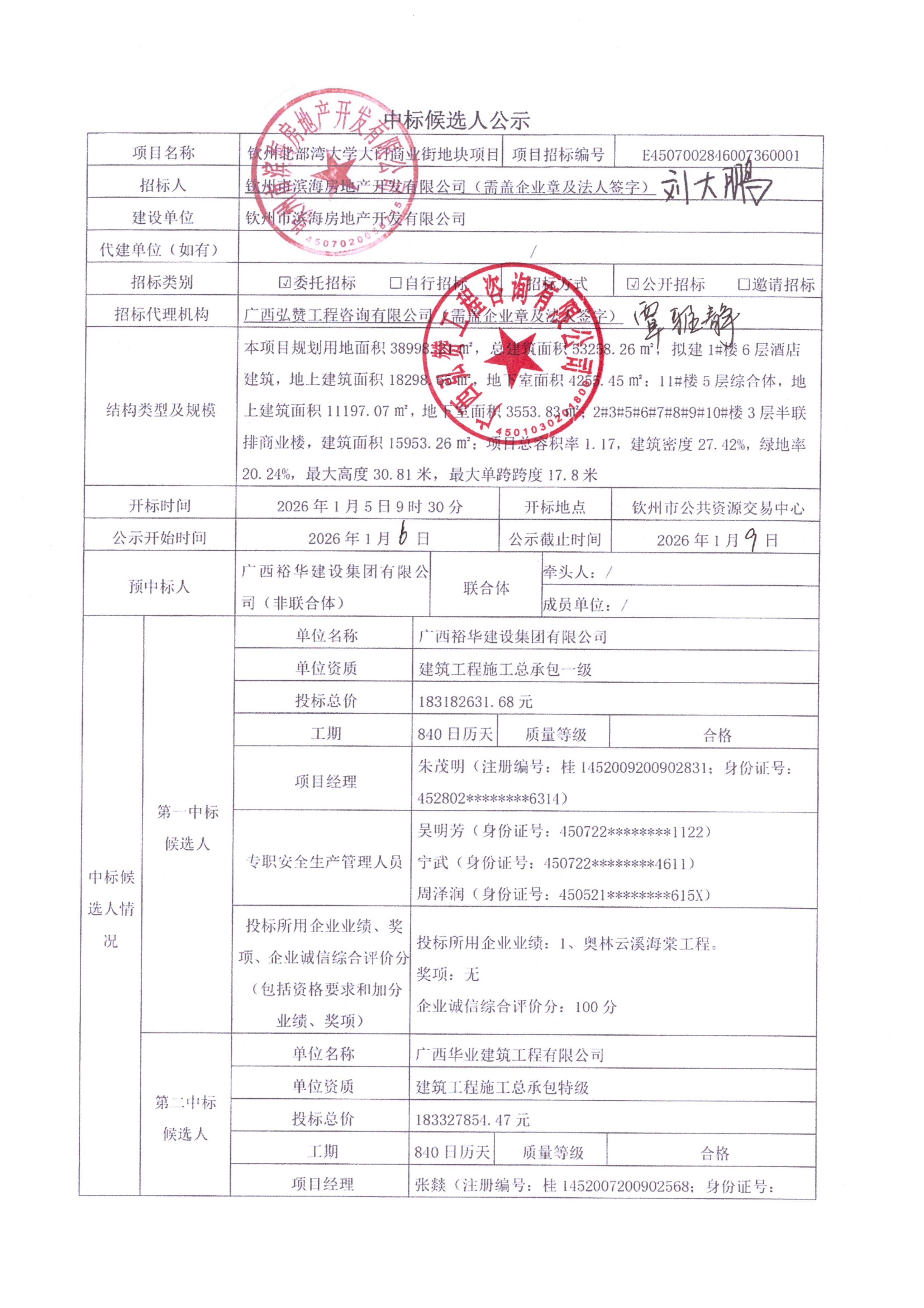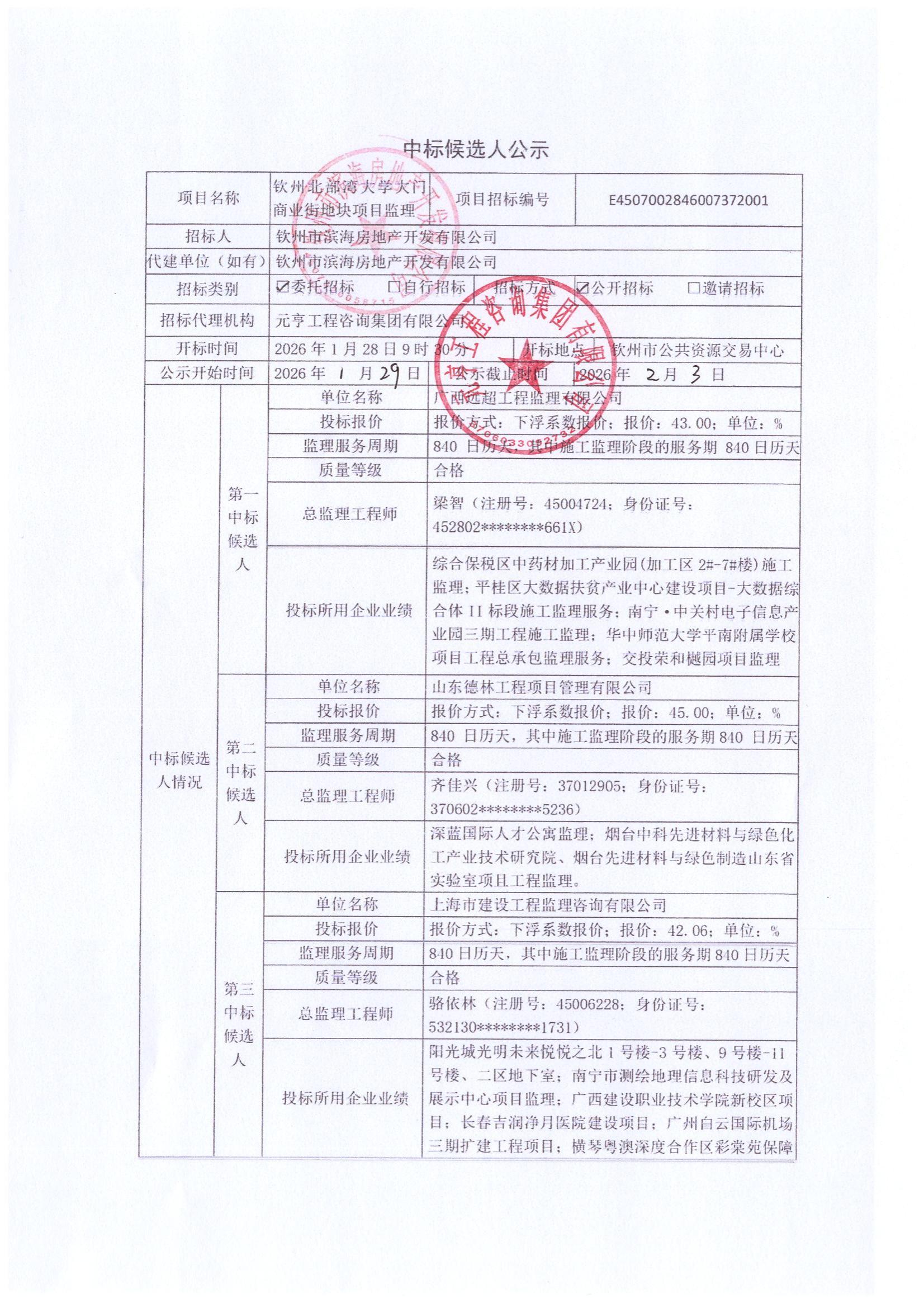 中標候選人公示(欽州北部灣大學大門商業(yè)街地塊項目監(jiān)理)