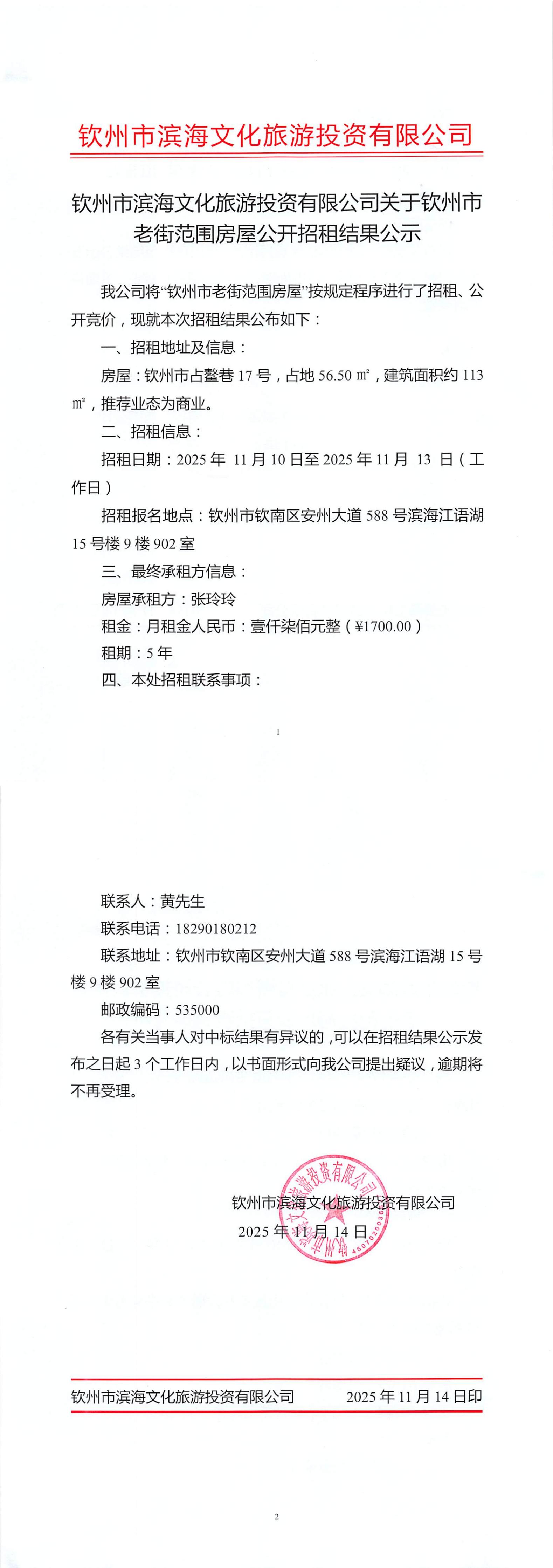 欽州市濱海文化旅游投資有限公司關(guān)于欽州市老街范圍房屋公開(kāi)招租結(jié)果公示
