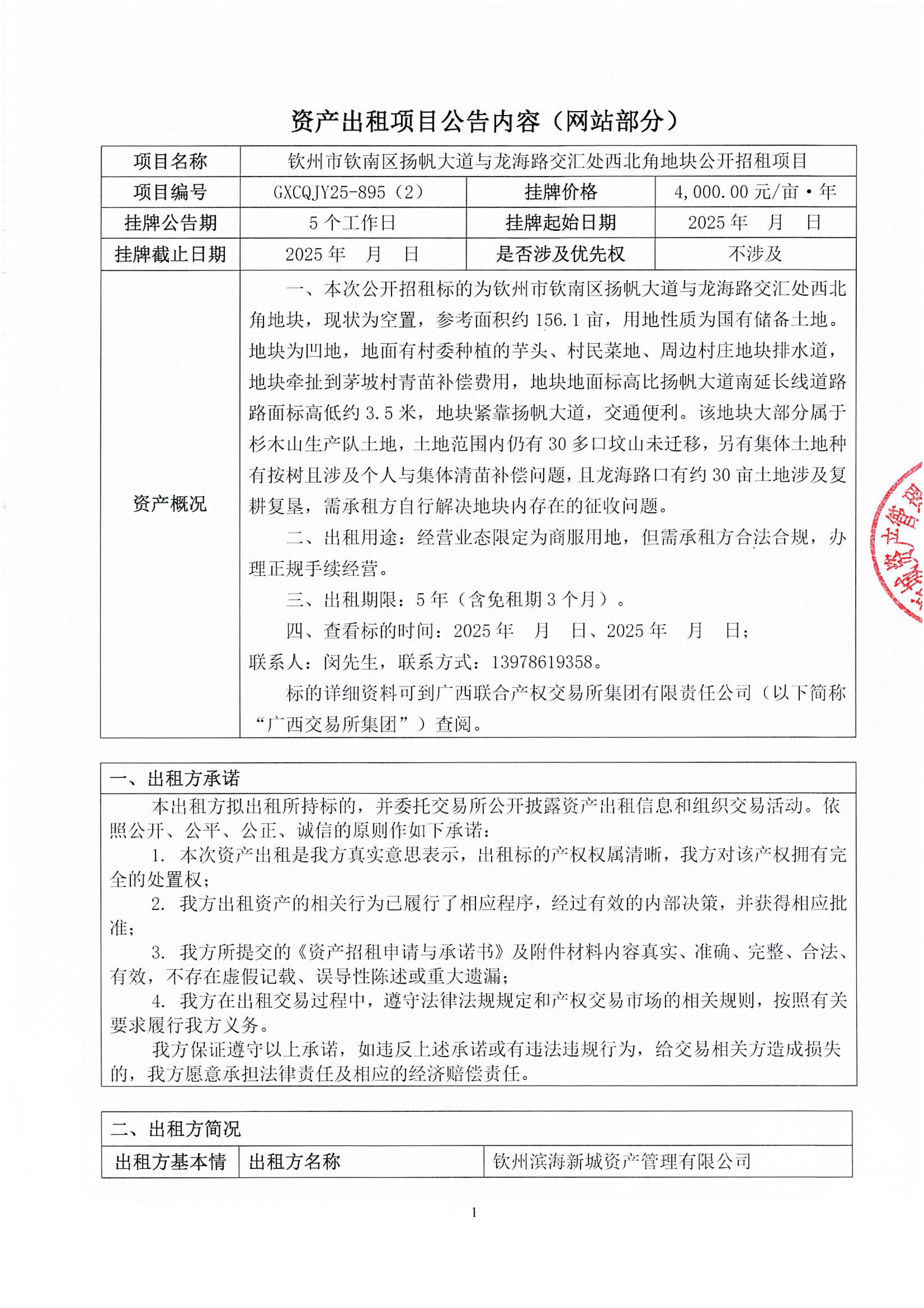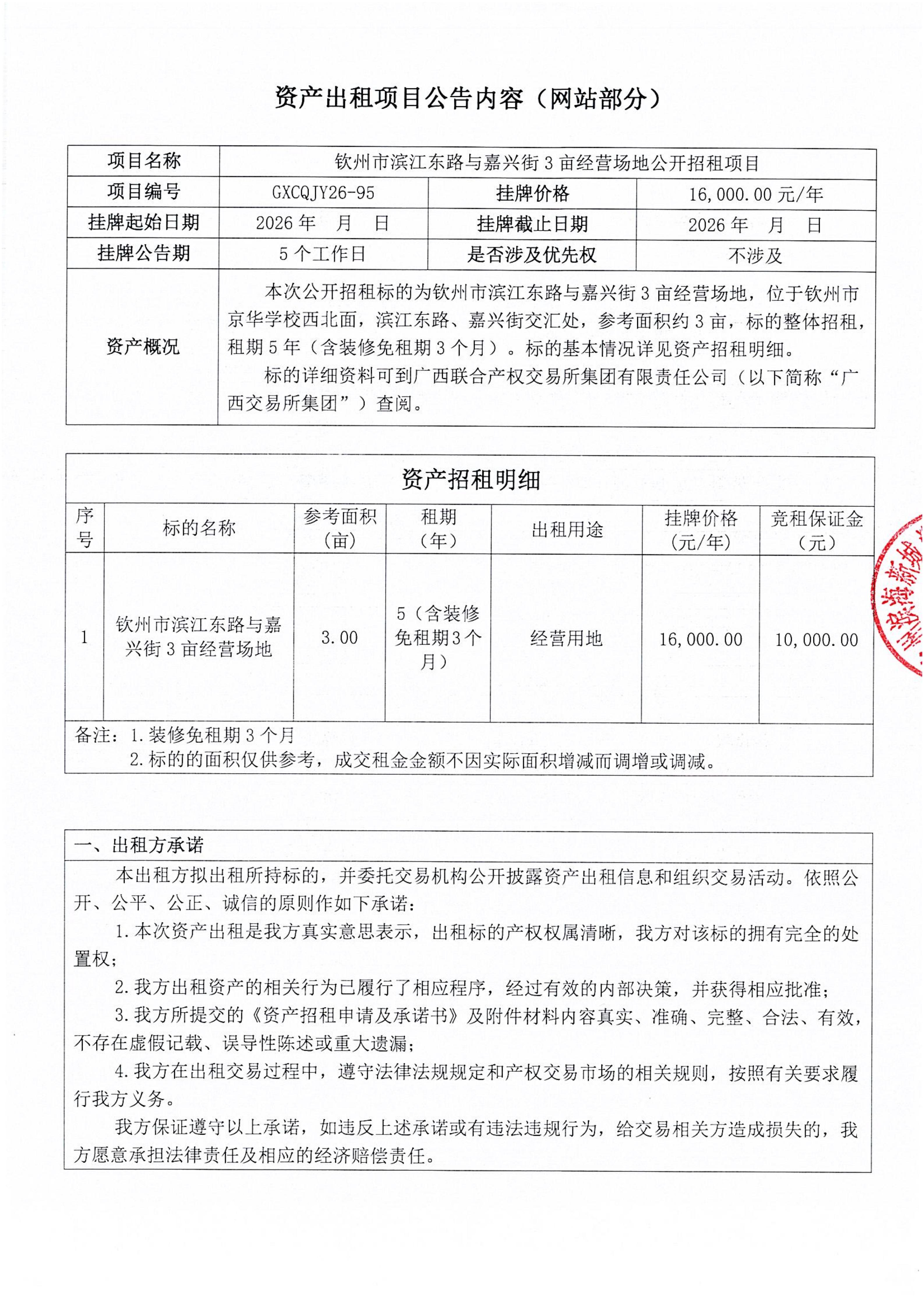 欽州市濱江東路與嘉興街3畝經(jīng)營場地公開招租項目