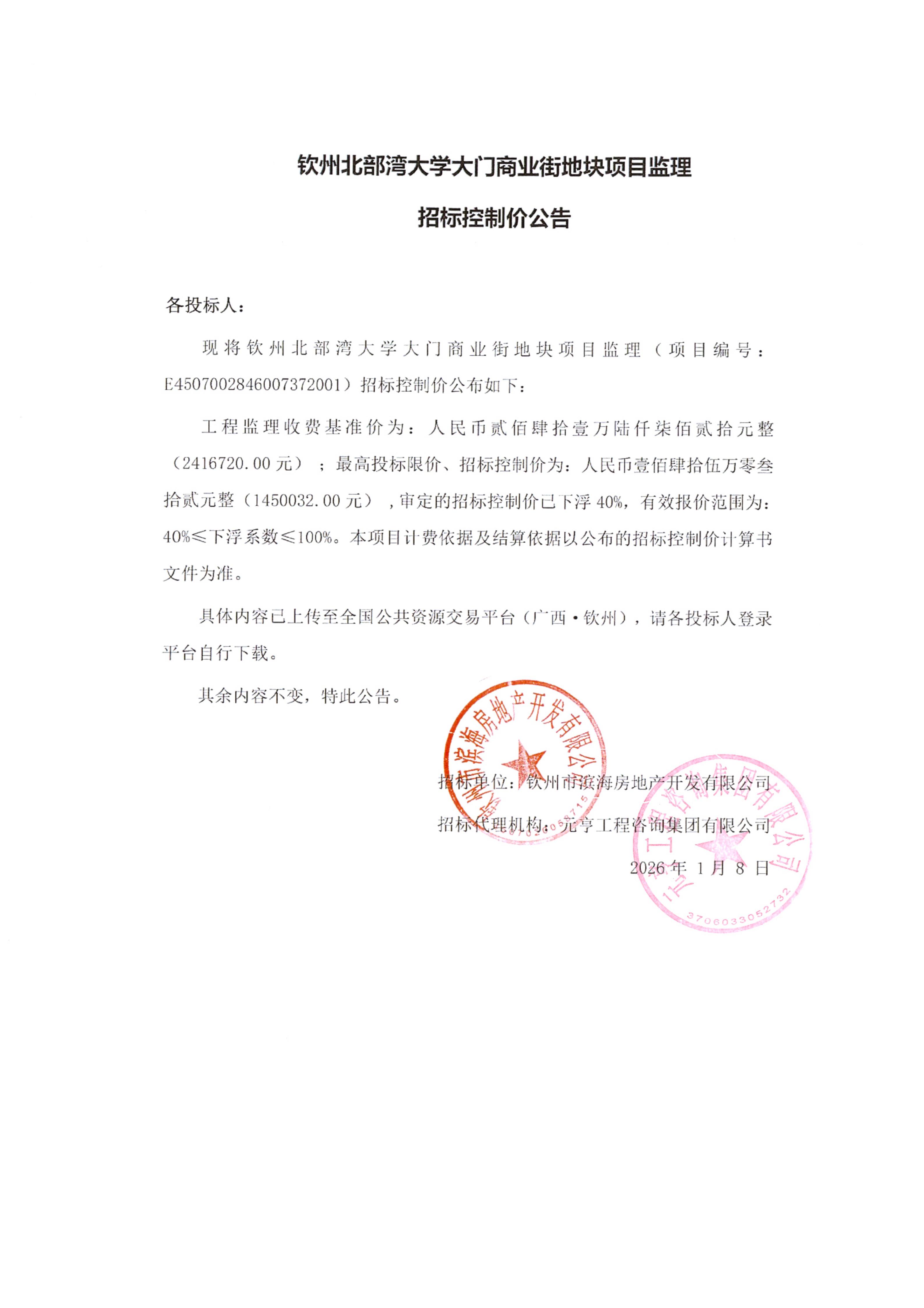 欽州北部灣大學(xué)大門商業(yè)街地塊項目監(jiān)理招標控制價公告